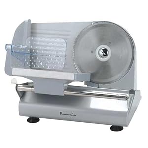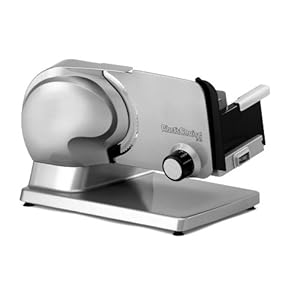 Features: Professional quality for home use. Slices a wide variety of foods via an easily adjustable slice control knob. Stainless steel cutting blade and carriage surface plus aluminum food-guide. Five-year limited motor warranty. Stable on countertop.