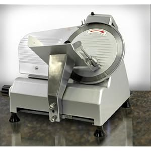 Designed to slice almost every edible in a kitchen, this professional quality food slicer from Waring makes quick work of meats, cheeses, breads, fruits, and vegetables. The slicer's premium stainless-steel and die-cast aluminum construction promises dependable, long-lasting performance. Moreover, it's safe, with nonslip operation and an aluminum food guide to keep hands and fingers away from the blade. The smooth-edged 7-1/4-inch stainless-steel blade is perfectly balanced and adjusts with a clearly marked width-control dial ranging from 1/32-inch to 1/2-inch. You can slice pepperoni paper-thin or cut a loaf of French bread into appetizer-size rounds. With comfortable, textured handles, the slicer is easy to use, and Waring makes cleanup as simple as possible with a scratch-resistant finish and a pivoting food guide. The slicer weighs 13-1/4 pounds, has a 14-by-8-1/2-inch footprint, and stands on suction cup feet to ensure stable operation. The motor comes with a five-year limited warranty. --Emily Bedard